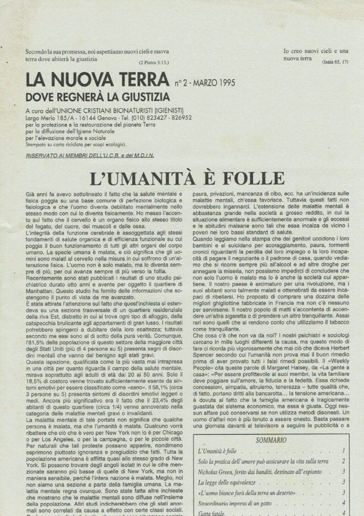 Periodico a cura dell’Unione Cristiani Bionaturisti Igienisti.